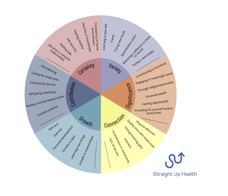 Try it out! The diagram below is a needs wheel. It outlines some common needs humans have. Take some time to go through the needs wheel and I identify which needs feel most relevant for you - or, write a list of your own top 10 needs.